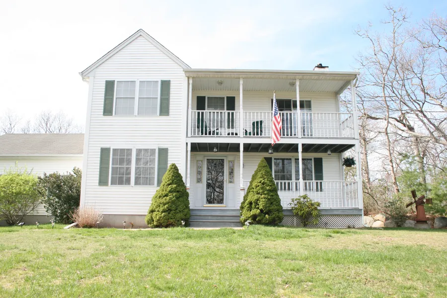 This Center Hall Colonial with two-story Southern-Style Farmer's porch is tucked high on a hill offering plenty of privacy and located in sought after Woodmere neighborhood. Master bedroom has private bath, large H&H closets, and access to upper porch with views of Block Island. Beautiful crown molding throughout first floor, formal dining room, spacious living room with marble gas fireplace, and granite counter tops with eat-in kitchen. Additional features: 2 car oversized garage, full basement with plenty of storage, deck all situated on 1.67 acre wooded lot. Close to many RI's beautiful beaches. Don't forget about Charlestown's low taxes!!!
