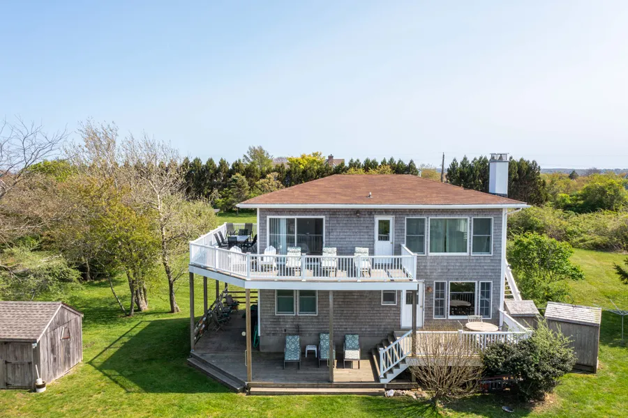 Enjoy amazing Atlantic Ocean views from this two-acre lot situated on West Beach Road. Expansive views of the Rhode Island and Connecticut coastlines and fabulous sunsets can be admired from the ¾ wrap around deck. Family favorite Mansion Beach, miles of greenway trails and one of the best beaches to surf cast off are all in close proximity to this home. This lovingly maintained lot has mature trees and a bonus shed for all your beach gear, bicycles and yard maintenance items. This upside-down house features an open living/dining and kitchen, half bath, guest bedroom and primary suite with full bath and deck access on the second floor. First floor has two bedrooms, full bath and great room with kitchenette. A five-bedroom septic system, gives you room to grow. So many options with this parcel, just open your imagination to the all the possibilities. Call for an appointment today.