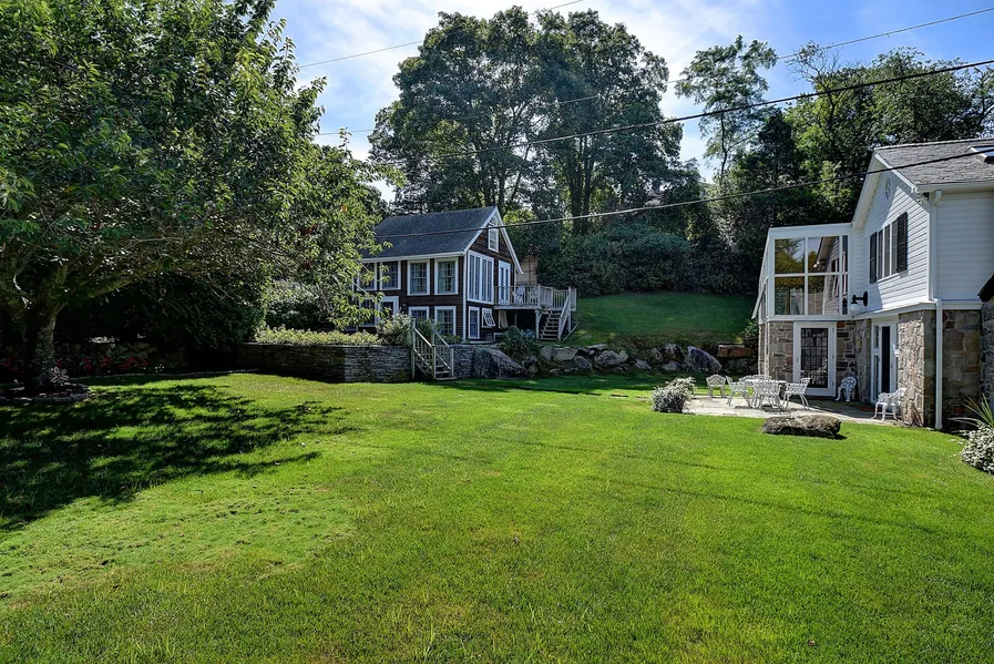 Tucked away on a private country-like road, you'll find this renovated carriage house and guest cottage with a restored garage/barn on an abutting "grandfathered" building lot. The carriage house custom kitchen features natural cherry cabinetry, Carrera marble counter tops, and gourmet appliances. The warm living room and welcoming den, off the kitchen, provide ample living area for entertaining and relaxing. The sun-filled two story dining room has an alluring slate floor, stone walls and numerous windows. On the second floor, you will find two bedrooms and one full bathroom. The guest cottage provides another kitchen, bedroom, and living area opening to a spacious deck overlooking the meticulous grounds. A ship's ladder, in the bedroom, leads you to a loft for more sleeping, an office space, or storage. The carriage house and guest cottage have...