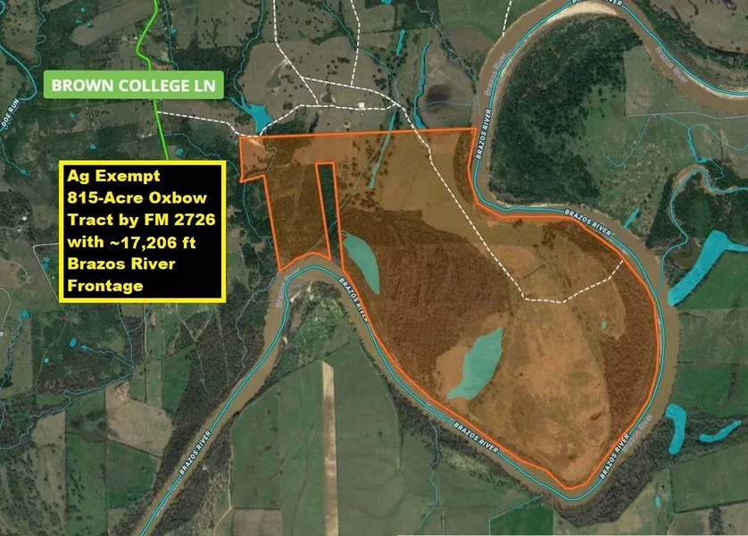 Seller Financed with Great Terms! Ag Exemption for Cattle! Washington County Oxbow Riverfront 815-Acre Hunting/Fishing/Cattle Ranch Near US-290 & TX-6 has ~17,206 ft Brazos River Frontage and is Part of ~2012.48-Acre Majestic Cattle Ranch which has been Subdivided. Access to the Tract is by Private Dirt Road to Brown College Ln. Property has Cross-Fenced Pastures, Clusters of Mature Oak Trees, Lakes, Ponds, Creeks, Expansive Views of Rolling Hills & the Grand Brazos River. Located 15 Miles to US-290/Chappell Hill & TX-6/Navasota Midpoint Between Houston & Austin. 40 Miles to Easterwood Airport/College Station. Perfect for Hunting, Fishing, Raising Livestock or Trail Riding. Infinite Possibilities: Single-Family Development, Campgrounds, Outdoor Club, Equestrian Facility, etc. Measurements are Approximate. Watch Drone Video! Pictures & Video are of the 2012.48 Acres and May Not Be Part of...