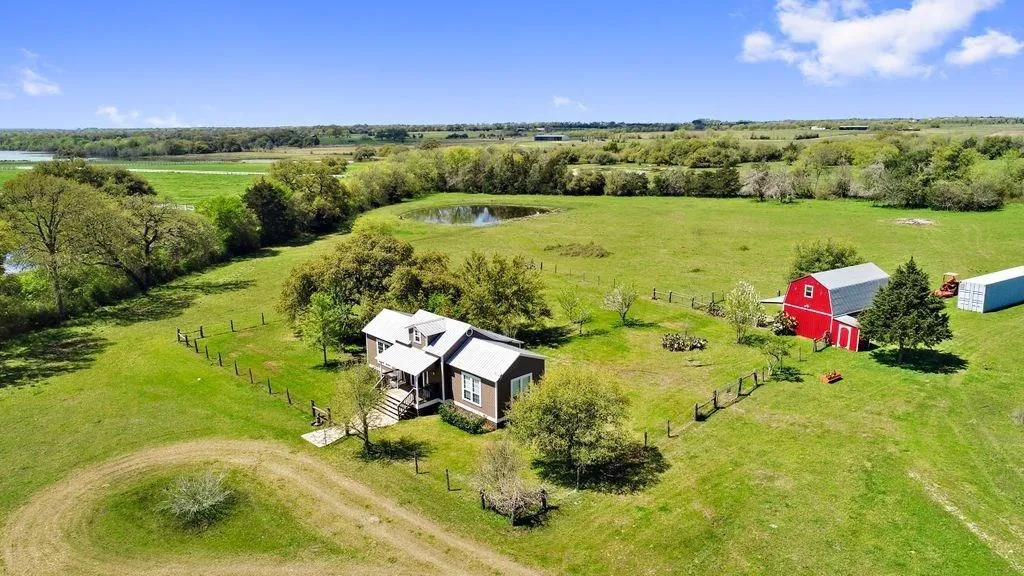 Built in 2004, the craftsman style farmhouse cottage sits on 14.12 acres with a pond, scattered trees and pasture land. The home is nestled some 250 yards off the road down a winding drive next to a massive 100-year-old live oak tree and has views of the pond and setting sun for peace and quiet.