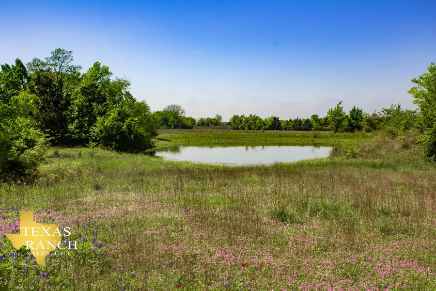 Over half of the farm is pastureland, with seasonal bluebonnets, while the rest of the acreage is mostly rich farmland with some areas of dense brush. At the front of the property is a six-acre hay field bordered with trees. Additionally, around two acres of thick woods line the drawl that feeds into a two-acre pond on the property. This pond is an excellent source of drinking water for cattle grazing on the land as well as the abundant native wildlife.