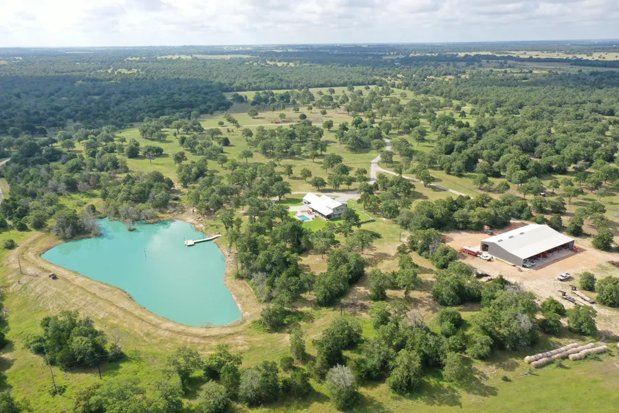 Getaway to the Hill Country right in your backyard! Explore the scenic terrain of the 341 acre property with its two creeks, multiple ponds, and natural beauty. Beautiful Hill Country elevations and rock formations combined with lush pastures of central Texas provide a home to free ranging wildlife and livestock. Part of the property is high fenced. Drive down the paved road to the main house that overlooks the relaxing pool and the alluring pond. The decked out outdoor kitchen is equipped with an oven, a stove top, a SmokinTex BBQ smoker, a Kokomo grill, and an Evo Grill to serve all your entertaining needs. Whether you are ready to host tailgates with the two outside TVs on the back porch or escape from it all and take in the views on the deck of the pond, this property has you covered. Feel right at home with the houses open floor plan, vaulted ceilings, fireplace, and wet bar. The master suite has a walk-in closet, spacious shower, large tub, separate vanities, and french door access to the back porch. There are two bedrooms upstairs as well as a guest house that provides a private place for your friends and family to relax. Have plenty of room for all the toys or equipment you want in the 9,750 sq. ft. barn that is tucked away in the trees. Come see this one-of-a-kind property!