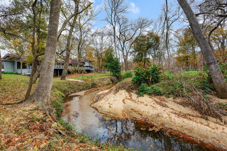 vanity, separate tub and shower, large walk-in closets, and, as with every room in this wonderful home, its own abundant view of the outdoors. At the opposite end of the home on the ground floor is an additional bedroom with its own bathroom and another living room nook. Two additional bedrooms are located upstairs, adjoined by a spacious bathroom and each with generous closet space. This home also features an artist studio at the corner of home with exterior walls of glass and a full bathroom, which easily allows for additional sleeping or conversion to a fifth bedroom. A large deck spans the entire back of the home, overlooking the creek. Whether a permanent home or a weekend getaway, this home is a secluded natural paradise.
