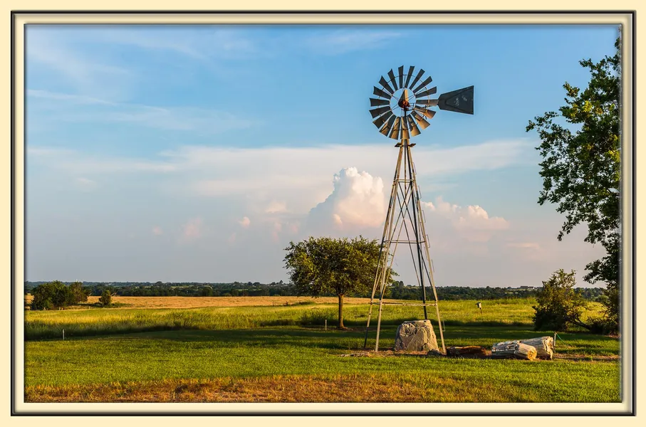 This charming, custom, ranch style home sits on a hill top with views for miles. There are 3 large, steel frame barns on the property and a sprinkler system that covers the rows of pecan trees in the yard as well as the flowerbeds. The improved grasses on the property allow for hay production which helps keep an agricultural exemption.
