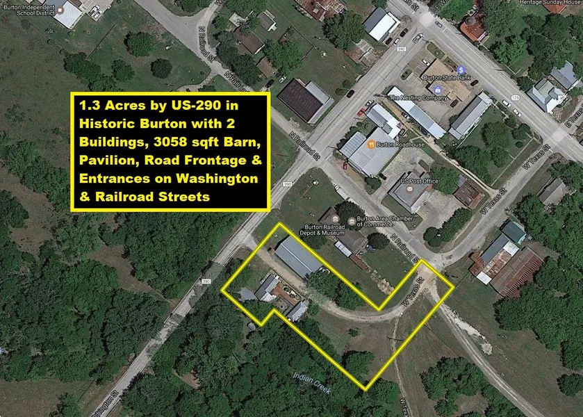 Just Reduced! Great Property at Great Price Located in Historic Burton by US-290 w/Road Frontage & Entrances on Washington Street & Railroad Street! Pig & Whistle Pub and Pickletree Deli-Biertgarten have Multiple Buildings totaling ~7690 sqft on 1.3 Acres. 1377 SqFt Pig & Whistle Pub has Full Bar, Commercial Kitchen, Dining Areas, Office & 2 Restrooms. 435 SqFt Pickletree Deli has Kitchen w/Bar, 427 SqFt Rose Garden Patio, 1060 SqFt Covered Patios/Breezeways and 1440 SqFt Biergarten Pavilion w/Bar, Ceiling Fans & Nice View of Trees Along Creek. 3058 SqFt Historic Barn-Style Warehouse has Wood Floor, Multiple Stalls w/Doors, Ceiling Fans & 320 SqFt Attached Metal Building with Half Bathroom. All Buildings have Metal Roofs & Electricity. Property has City Water/Sewer, ~168 ft Road Frontage on Washington St & ~80 ft Road Frontage on Railroad St. Historic Burton Railroad Depot & Historic Cotton Gin are located next door. Property is conveniently located midpoint between Houston & Austin with both ~80 Miles Away. Great for Flea Market, Restaurant with Piano Bar, Bakery with Deli, Tearoom with Specialty Stores, Antique Store, Wedding Venue, Event Center, Cowboy Church with Community Center. Some Furnishings, Equipment, Piano Included (See INVENTORY TO BE INCLUDED IN SALE PRICE in Docs). Use of Business Names Allowed! Buyer to Buy New Survey! Short term owner financing may be available! Per Seller: Lot had ~33 inches of Rain; No Structures Flooded in Harvey!