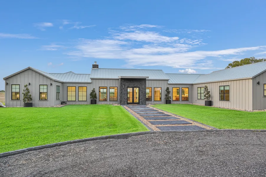 Enjoy a QUIET RETREAT to the country - just minutes from Brenham and Round Top area! NEW CONSTRUCTION sitting on +49 ACRES of rolling terrain overlooking towering LIVE OAKS and a private LAKE, this custom 4 bedroom 4 1/2 bath MODERN STYLE home boasts clean lines, expansive windows, and stunning sleekness. Modern architecture comes together perfectly with the warmth of wood, wonderfully coordinated granite, stone, and tile in kitchen and bathrooms, complementing fixtures and hardware, and an open concept floorplan from kitchen counter to fireplace. The windows on the front and back of the home allow for stunning views and showcases the comfortable luxuries of both the interior and exterior living areas. The outdoor kitchen overlooks the pool, a picturesque 170' wood pier crossing over the lake and leading to the 4,000 sf work shop. Pipe fencing, automatic entrance gate, extensive side wal...