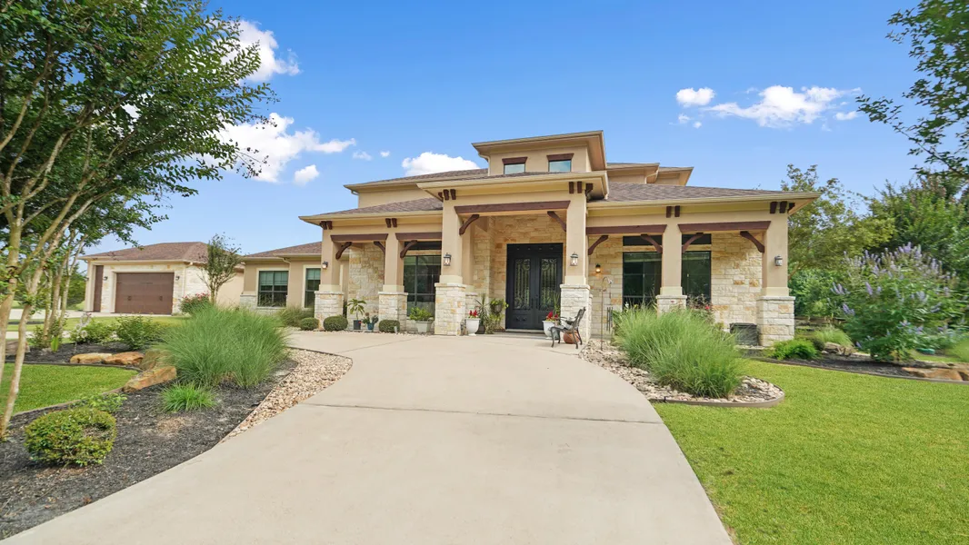 This exquisitely designed estate, situated on 11.5-acres, embodies meticulous craftsmanship & attention to detail at every turn. As you step through the double iron doors, a captivating open concept living space unfolds before you, seamlessly connecting the formal dining room, kitchen, and living area. The gourmet kitchen, adorned with granite countertops, Thermidor appliances, built-in fridge, & a copper sink. The living area, showcasing a floor-to-ceiling stone fireplace that perfectly frames breathtaking views of the backyard oasis. Retreat to the generously sized master bedroom, where opulence meets functionality. Indulge in the spa-like bathroom featuring a garden tub, walk-in shower, double sinks, & an expansive walk-in closet. The home features a well appointed study, mud room, utility room w sink, just off the garage entry & a gameroom + media room on the 2 floor. Meticulously manicured yard, 3 stall barn w tackroom , chicken coop, loafing shed & pool. Property is ag-exempt.