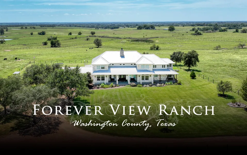 Approx. 60.72 acres offering panoramic views that stretch as far as the eye can see. The centerpiece of this estate is a custom home boasting formal dining room, spacious living area with a stone fireplace, chef's kitchen, small media sitting area and laundry-mud room with walk-in pantry and full bath. Also downstairs is the primary wing featuring a bedroom with sitting area, spa-like bathroom, and an exercise-flex room. Ascend the stairs to find a private office with three desk areas and large built-in bookshelves. Upstairs is a second living area with balcony and three additional bedrooms and baths. The home was designed to be low maintenance so you could enjoy every minute you are there. Outside is the back porch with bar and seating area and a sparkling pool, complete with hot tub, cabana and fire pit area. The property offers open pasture, wooded area, utility barn, Live Oak trees and an abundance of wildlife. Forever View Ranch is conveniently located 4.5 miles to Chapelton Vineyards and 15 minutes from Brenham with easy access to College Station.