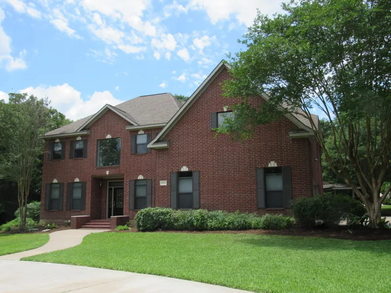 Fabulous custom brick home built on a large beautiful lot located in the back section of Oak Hill Acres Subdivision also features a private entrance gate at back from Pledger Rd. Concrete circular drive in front of home plus drive leading to back of property. Leaded glass front door opens to foyer which has tall ceilings & oak wood floors. Formal living and dining rooms located near entry. Kitchen / breakfast opens to a family area which has a full size brick fireplace which is surrounded by windows overlooking the back yard area.