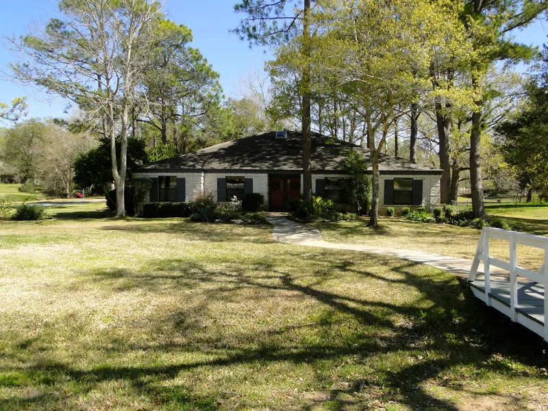 Custom Home 1-story brick home sitting on 1+ acre shady lot in one of Brenhams most sought after neighborhoods. Great 700+ square foot outdoor entertaining area with lush landscaping and open views will delight your guest. The living area consist of approx. 2700 square feet. The updated kitchen features granite counter tops, double oven, double dishwasher, range top with microwave/vent all in stainless steel. The breakfast nook with morning light has a view of the patio. Laundry room has room for a freezer, granite folding area and a bath. Warm and inviting Den (15 x 21) with brick wall and hearth showcasing wood burning fireplace and 2 sets on built in bookcases and raised beamed ceiling beautiful saltillo tile floors. Formal living and dining areas both 15 x 12 allow for large dinner parties. All 4 bedrooms are very spacious with good size closets, the master bedroom is 12 x 17 with tile floors and French doors to the patio and updated master bath with built in vanity and lots of storage. Covered patio connects home and garage. Long driveway has extra parking and accesses the side entry 2 car garage with storage closets across the back with one opening to the yard for mower storage.