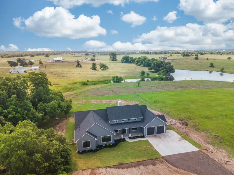 This newly built Mercy Creek Homes custom farmhouse is a gray and stone beauty! It is thoughtfully laid out to use every inch of the floor plan and flows amazingly well. It features gorgeous wide-plank engineered wood flooring throughout the home (with the exceoption of bathrooms and the laundry room), three sets of solid wood double doors, an owner's retreat patio area with a private fireplace, and a breathtaking back porch view. One of the most special features, however, that cannot be replicated is the grove of aged live oak trees that line the one side of the home. Designed to highlight this sight is an L-shaped back porch with stained ceiling beadboard--perfect for rocking chair evenings!