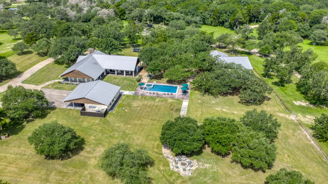 Experience privacy, scenic views, and upscale ranch living just 14 miles from Brenham. This stunning 135-acre property features rolling terrain with wooded areas, improved pastures, scattered oaks, two stocked ponds, and a wet-weather creek with dramatic stone outcroppings. The entire ranch is enclosed by an 8' high game fence and is home to exotic and native species including Whitetail deer, Axis, Sika, Blackbuck antelope, and Painted Desert sheep. The 3,693 SF main residence is a custom 4BR/3.5BA contemporary ranch-style home with native stone exterior, metal roof, open-concept interior, vaulted ceiling with exposed beams, and floor-to-ceiling stone fireplace. White oak floors, tall windows, and a chefs kitchen with granite countertops, oversized island with dual sinks, gas range, commercial fridge, and abundant cabinetry complete the main living space. The primary suite includes a private fireplace. A matching 1,876 SF guest house offers 4BR/4BA, open living/kitchen with granite counters and large island. Outdoor features include a swimming pool, firepit, 3-car garage with glass roll-up doors and covered carport. The garage and covered carport are currently being used as a covered entertainment space, and an enclosed game room. Equestrian-ready with a 45x50 barn featuring brick floors, 3 horse stalls, 2 goat stalls, 3 tack rooms, plus grooming/wash station. A 1,176 SF mobile home provides on-site accommodations for a ranch manager. Community water for homes and water well for irrigation. Only 30 miles to College Station and 86 miles to Houston an exceptional blend of ranch lifestyle and modern luxury.