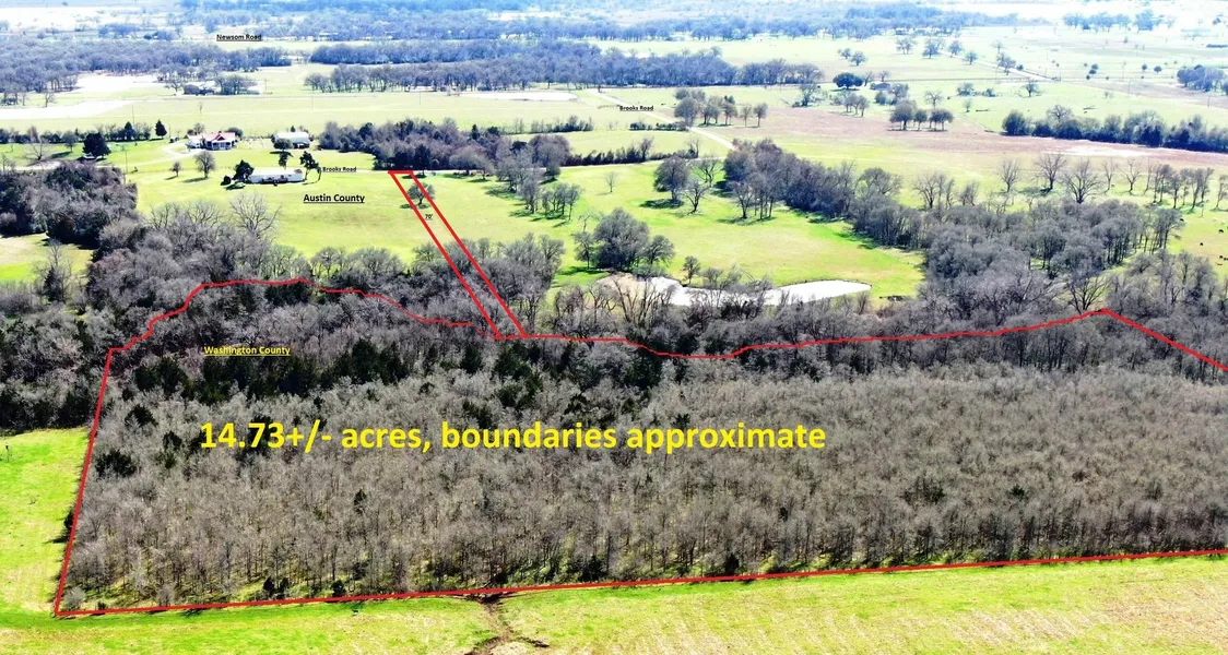 Heavily wooded tract that straddles Austin and Washington Counties, with access from Brooks Road in the Cochran/Buckhorn area of Austin County. Successful buyer will want to create crossing of Caney Creek to access the 14.83 +/- acres in Washington County. Access will be from the Austin County portion of the property by way of 70' strip to be purchased in fee (1.7+/-acres) that is included in the 16.53+/-acres. All Acreages are Subject to new Survey paid for by buyer. Access Across Caney Creek will be extremely difficult. Property designated by FEMA as High Risk for flood.