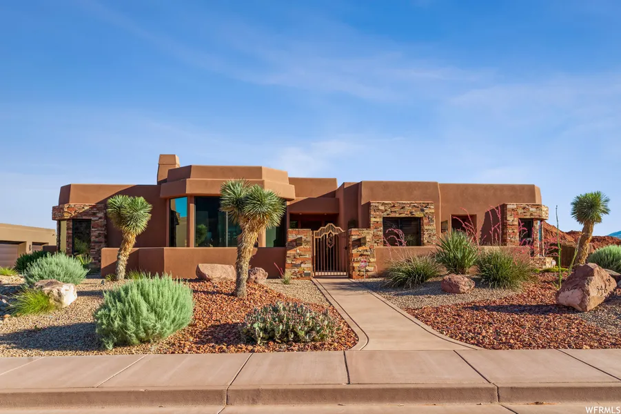 Significant Price Improvement to make this the choice for your next home! A great getaway or full time luxury home with a modern southwest flair in immaculate condition Turn key advantage with designer furniture, accessories, linen & kitchenware package option available for immediate occupancy Stunning panoramic views of Big Red Mountain and beyond Only minutes away from Tuacahn, Snow Canyon, many hiking & biking trails, downtown St George and close to golf courses, quality restaurants and 30 minutes from St George Regional Airport. Within walking distance to the Toe Trail at the base of the Big Red Mountain. Quiet cul-d-sac location in the prestigious Palisades area on .43 acres with adjacent walking park 4 bedroom (includes office/bedroom option) 5 bathrooms (1-full, 2-three quarter and 2 one half) Office/bedroom with beautiful view of red mountains, hickory floor, and wood beamed ceiling, closet and bath with skylight. Large master suite with great views of the red mountains, indirect ceiling lights, bubble soaker tub, walk in shower with wall mount, hand held and rain heads, heated tile floor, access to patio and walk in closet with built in cabinets and wood faced shelves. Beautiful kitchen overlooking waterfall in backyard. Double wall ovens, French door fridge with lower freezer, microwave, reverse osmosis system, walk in pantry, gas stove top and self-closing cabinet doors throughout the home. Spacious great room with spectacular view of the Big Red Mountain, motorized 95% sunblock blinds, complete audio/video system, gas fire place surrounded by natural rock from floor to ceiling, built in niches, indirect ceiling lighting, and more. 10, 11 & 12' ceilings. Laundry room with abundant cabinets, skylight, washer/dryer on pedestal and stainless steel sink. All countertops are coordinated granite with stone/tile backsplashes Large casita with separate outside entry, private bathroom with walk-in shower, kitchenette with sink, fridge, microwave and great views. 3 car garage with enclosed storage room, utility sink and custom finish floor with man doors to driveway and patio. Gated driveway to protect vehicles, RVs, boat, etc. Professionally landscaped yard with automated, remote controlled drip system, yard lights on a timer, stone path to separate raised patio, waterfall and stream, fire pit with natural rock surround, covered patio adjacent to home with gas connection and skylight. Block wall surrounds entire back yard. Special features: Alarm system, water sensors, heated master bath floor, immediate hot water, camera system monitors inside and out, soft water conditioner, 2 furnaces/AC with high efficient Aprilaire filters, 2 water heaters, Control4 remote access from anywhere to view and adjust thermostats, cameras, security system, drip system timer and more. Professional sound system and large screen smart TV. Central vac. Wood shutters. All showers are walk-in. 5 skylights. 2x6 exterior walls with extra insulation throughout. Wood/metal encasement crank out windows. Gated entry courtyard.