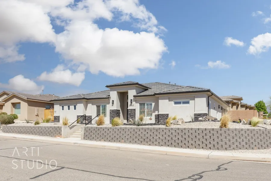 Welcome to this exquisite, modern residence in the heart of St. George, UT. Located at 2643 E 380 N, this stunning home features 4 bedrooms and 2.5 bathrooms across a spacious single-level layout. Recently constructed, the property boasts contemporary design and high-end finishes, including a gourmet kitchen with sleek cabinetry, stainless steel appliances, and a large island—perfect for entertaining. The open floor plan flows beautifully from the kitchen into the cozy living area, complete with a stylish fireplace. Elegant bathrooms feature modern fixtures and tile work, creating a spa-like feel. Generous bedrooms offer ample natural light and storage. Outdoors, enjoy a serene backyard with a covered patio, ideal for relaxing and enjoying the sunny St. George weather. This home embodies luxurious living in a desirable location, providing both comfort and sophistication. Don't miss the opportunity to own this beautiful home in a vibrant community.