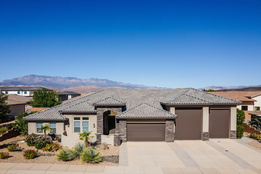 This single-level Dixie Springs home offers contemporary finishes, a functional layout, and exceptional garage space. The open kitchen and living area feature vaulted ceilings, stone and tile accents, and granite countertops for a refined, cohesive look. The primary suite includes a spacious bedroom, private bath, and direct access to the backyard hot tub. Mature landscaping and a fully fenced yard create a comfortable outdoor setting. The RV garage bays measure approximately 37 and 45 feet in length, each with a 12 plus foot garage door. The 220V power connection, drain and hot and cold water make it a fully functioning space. Set just minutes from Sand Hollow Reservoir, Sand Hollow Golf Course and endless trails. Welcome home. Note: Some of the images have been virtually altered.