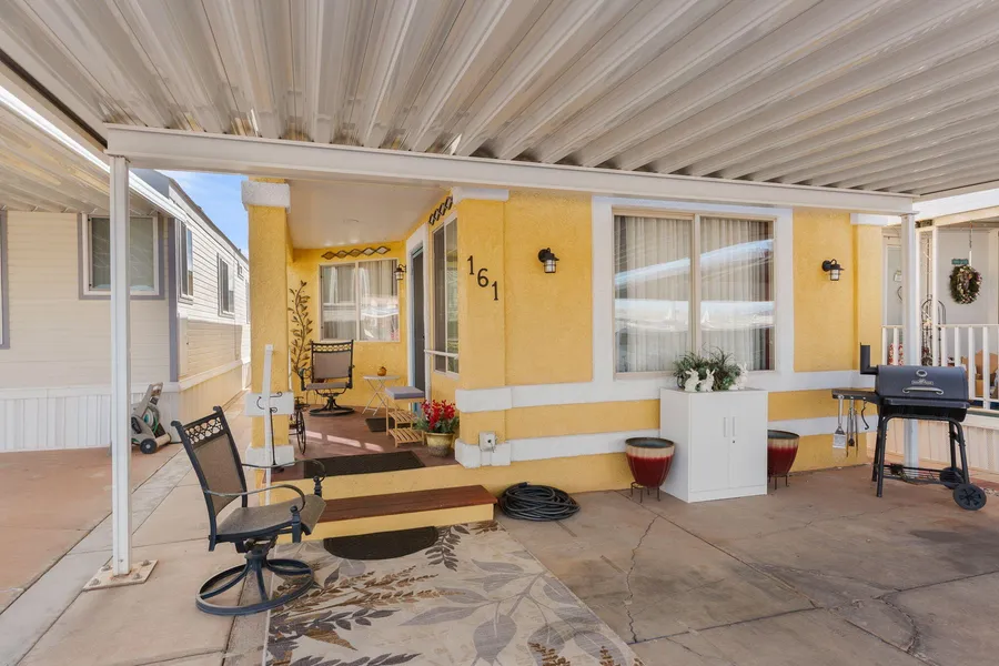 Stunning decorated design is what you will see when you enter this perfect second or retirement home. Custom paint throughout, new draperies with rods and new efficient HVAC & PRV in 2025. Full-size updated kitchen features pull-out shelving and lazy-susan. Generous living space includes bedroom, walk-in closet, large pantry, and with comfortable dining area. Dedicated laundry room, workplace office space and lovely bathroom with a designer touch. This Doll House located in a 55+ community is professional re-designed offering comfort and luxury living in a generous space of 710 sq. ft. with a large 8' by 10' storage unit with security light and exhaust fan. Low HOA of $105 a month, includes enclosed pool, hot tub, 2 clubhouses, sewer, water, garbage and more. A must to see.