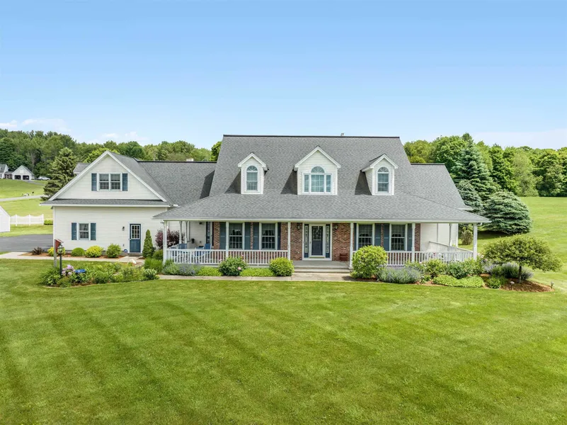 Beautifully landscaped on a rolling site with commanding views, this spectacular residence exudes refined elegance and comfort. Crafted with meticulous attention to detail, it features a wraparound covered porch, perfect for summer evenings. The open, two-story foyer leads to a central living room with cathedral ceilings, a cozy fireplace, built-in bookshelves, and a second-story balcony. The inviting dining room boasts rich cherry flooring, while the kitchen is adorned with cherry cabinetry, a large island, and stone countertops. A cozy breakfast area opens to an east-facing back porch and brick patio. The main level includes two en-suite bedrooms. The primary suite, located at the rear southeast corner, features a walk-in closet and a tiled bathroom with a separate shower and large jetted soaking tub. An adjacent private sunroom offers a quiet place to read or relax. The second en-suite bedroom provides an option for dual primary suites. Upstairs, two bright and spacious bedrooms each have traditional A-dormer windows, adding character. One bedroom includes a large attached office or hobby space. Additionally, an impressive 16' x 35'6" den connects to the main level via separate staircase. The lower level features a recreation area with a wet bar, built-in cabinetry, a half bathroom, and pool room. The attached three-car garage is heated and includes a second interior stairway to the basement level. The property also boasts a carriage house with two additional garage bays.