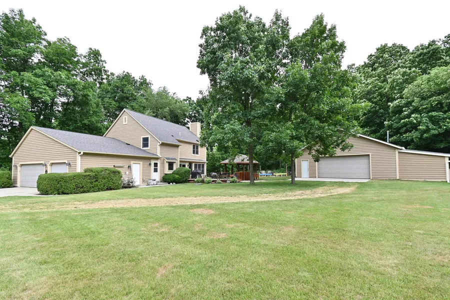 Town of Erin, beautifully updated spacious 4 bedroom 2.5 bath country home. Enjoy private wooded seclusion. 3 car attached garage plus a large insulated heated detached 30 x 30 shop/garage for all your tools and toys. Over-sized rms, lots of closet and storage space. Newer kitchen cabinets, counters tops, updated flooring, well cared for and loved home. Main level laundry/mudroom plus butlers pantry. Relax or entertain on the spacious deck, cozy built in firepit area and fantastic one of a kind pavilion complete with bar, tv, custom lights and more! Great yard includes, pines, fruit trees, mature shrubs and perennials. Nestled in the Kettle Moraine, near Lowe Lake Conservancy, Pike Lake and golf courses. Private lot, spacious home, multiple garages. Private 3 ac park in subdivision.