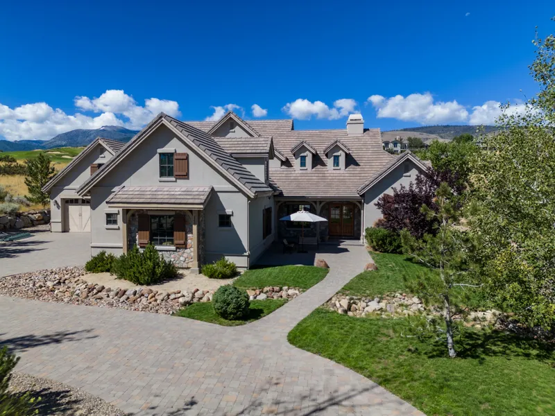 Welcome to an exquisite and timeless French country estate nestled at the end of a quiet cul de sac and alongside Hole 3 of the prestigious Arrowcreek golf course. This generous 1.28 acre parcel sits across from county owned land for ultimate privacy and Sierra mountain range views while maintaining close proximity to the Club at Arrowcreek amenities and front entrance to the community. Greeted by a picturesque exterior with textured stone, rustic wood elements, and a gracefully pitched roofline, this sprawling 5,967 square foot residence exudes the warmth of a country cottage. The wrap around driveway leads to a split 7 car oversized, heated “gentleman’s garage” with ample storage space, RV/boat 10 ft doors, plumbed with a 220V air compressor, fully insulated doors, and a separate attached entrance leading a large upstairs flex space over the garage. Four true bedrooms with master on the main level, an additional 2 spacious multi-use rooms, a surround sound loft/game room, and 6 and half bathrooms showcase ample living spaces for a large family, multi-generational, or professional needing office/business space. A true “Entertainer’s Home”, the owner partnered with architect, Steve Miles, to create functional flow that supports single level living. With an open kitchen adjacent to two patios, sweeping ceilings that expand the formal living room, a wet bar off the second dining area, a laundry room with sink and tall cabinets, and guest quarters upstairs and opposite the master wing for separation. Three HVAC zones, a humidifier system, electronic air cleaners, five zone irrigation system with two drip zones allow for ease of maintenance. Some key luxury features of the interior display Knotty Alder doors and trim, maple cabinetry, floor to ceiling custom stone wood burning fireplace, coffee bar in the master with Bay window for reading nook, double walk in closets, master soaking bath tub with double vanity sinks, Thermador kitchen appliances, granite countertops, and flawless hickory hardwood flooring. The outdoor space represents a sanctuary reminiscent of a European courtyard. Mature landscaping that frames the home hosts numerous pine trees, Aspens, and a dry creek bed for proper drainage. Enjoy the serene sunsets with the visiting wild life from the West patio or coffee on the entry patio at sunrise, and see the allure this French country lifestyle home embodies.
