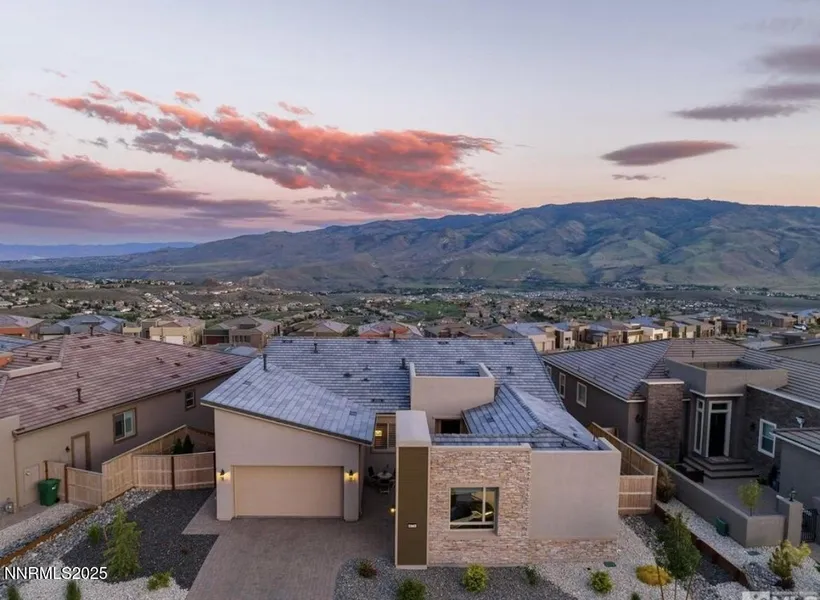 Stunning Modern Home in The Cliffs at Somersett. Discover luxury living in this exquisite 5-bedroom, 5.5-bathroom home located in the prestigious Cliffs community of Somersett. Perched on a premium 180-degree view lot, this meticulously designed residence boasts breathtaking mountain views, sophisticated architecture, and high-end finishes throughout. Enter through a private front courtyard into a spacious open floor plan highlighted by floor-to-ceiling picture windows, hand-troweled walls, and a striking rolled steel fireplace with I-beam detail. The custom glass and wood staircase sets a contemporary tone, while 7" white oak plank flooring adds warmth and elegance. The entertainer's kitchen is a showstopper, featuring a massive 9-foot quartz island, Sub-Zero refrigerator, JennAir appliances, double ovens, a walk-in pantry, and soft-close dovetail cabinetry. Designer light fixtures, black matte hardware, and Italian porcelain surfaces complete the sophisticated design. The walk-out basement includes a newly added fireplace with Italian tile surround, covered patio, and an in-ground hot tub overlooking stunning mountain vistas. Upstairs, enjoy seamless indoor-outdoor living with a multi-panel corner sliding door leading to a large deck-perfect for entertaining. The luxurious primary suite offers a cozy fireplace, spa-like walk-in shower, double vanities, and a spacious walk-in closet. Additional highlights include dual-zone HVAC with two furnaces and water heaters, smart home security, insulated interior walls for soundproofing, never-freeze roof de-icing system, TV/data smurf tubes, a pure water softener, and professionally designed WaterSense landscaping. With a 3-car garage, large laundry/mud room, and exceptional craftsmanship throughout, this home offers comfort, style, and functionality in one of Reno's most sought-after communities.