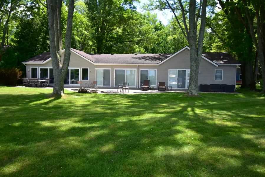 Arguably the best lot on all sports Base Lake! Located on desirable stretch with 100of water front on extra deep wooded level parcel with additional parking across the street. Door walls spread across entire home providing gorgeous views of the lake all leading to patio. No steps here in this sprawling ranch. Renovated kitchen with tiled backsplash and island with a snack bar all open to dining and great room. Stacked stone fireplace in the spacious great room. Enclosed porch adds another large area for entertaining. Master bedroom is on lake side with walk in closet, private full bath and door wall to outside. 2 car detached garage. Outbuilding set up for a recreational area for the kids. South Base Lake Association with stock certificate. Walking trails located on other side of private road.
