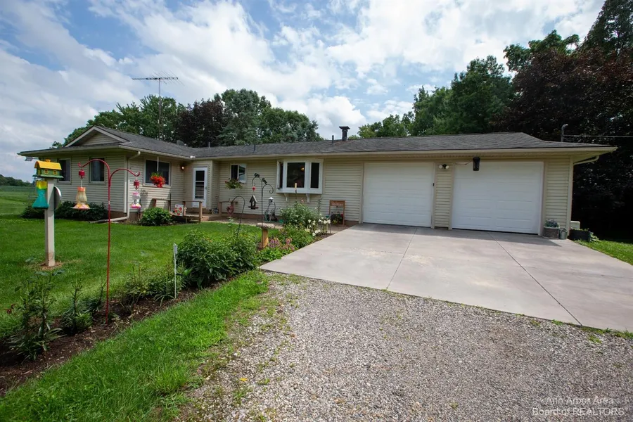 Over 34 acres of farmland with splits available. Lots of wildlife in the area. Ranch style home with walkout lower level. Enclosed porch and deck overlook stocked pond. Whole house standby generator. Outbuilding with water and electric. 2 septic systems on property.