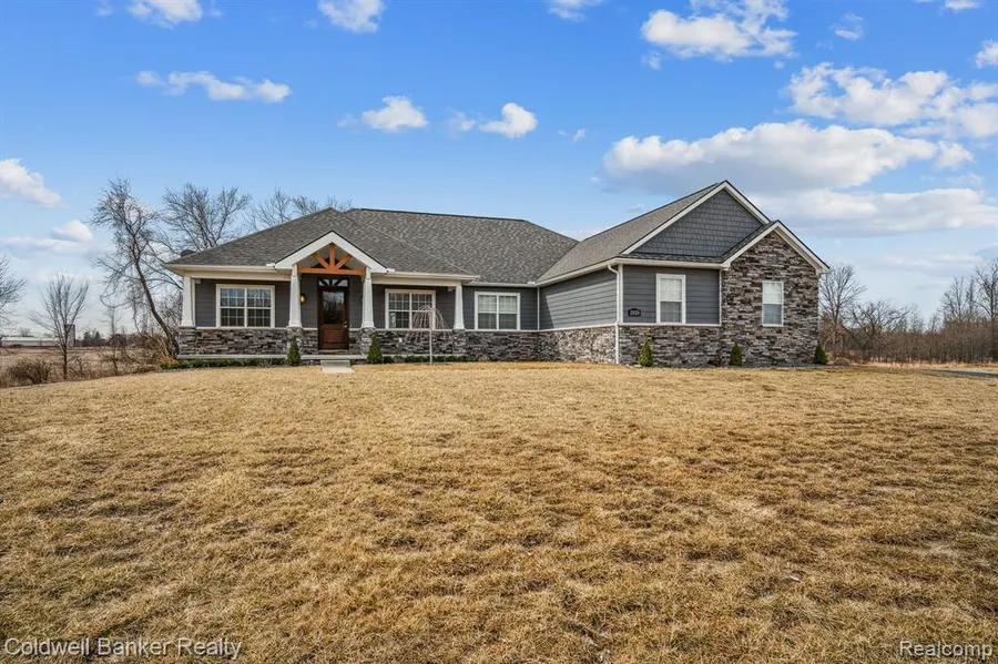 This one is a SHOW STOPPER! Every detail has been masterfully designed in this exquisite, custom built, ranch on over 5 acres giving you privacy, but is conveniently located to shopping, recreation, expressways, Brighton & Ann Arbor. You are going to love the open concept floor plan which is perfect for everyday living or hosting a large gathering. The chef of the family will appreciate the high end appliances including a Wolf gas range, double ovens, the large center island, and the huge 5' x 12' pantry. The great room boasts beautiful hardwood floors, a natural stone, gas fireplace, and 18 ft ceilings. The spacious & luxurious primary bedroom ensuite takes over the entire west side of the house and features dual walk-in closets, dual sinks, a relaxing soaking tub, and a 4' x6' shower. The other two bedrooms have walk-in closets and reside on the opposite end of the home and share a jac...