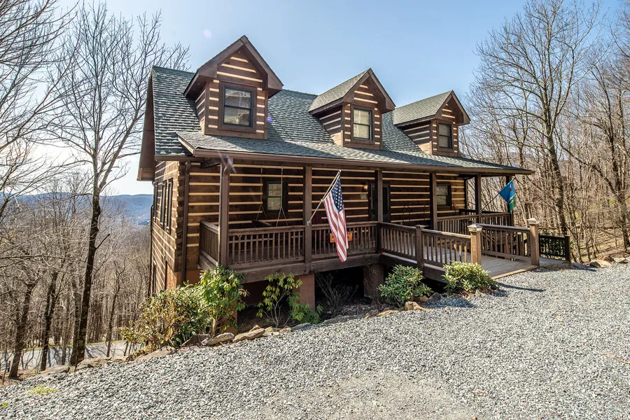 Step into this inviting four-bedroom, three-and-a-half-bath log cabin perched atop Seven Devils with long-range views over the valley and toward Grandfather Mountain. You'll see the charming staircase with reclaimed posts from R.J. Reynolds Tobacco Company and heart pine risers in the foyer, that leads into the living room with vaulted ceilings and a wood-burning fireplace. The kitchen offers plenty of cabinet storage, granite countertops, stainless steel appliances and a pantry. The primary suite is on the main level with access to the oversized deck. Upstairs offers two oversized bedrooms with dormers to take in the views and one full size bath. Downstairs you will find a game room large enough for a billiards table, bedroom, bonus room, one full size bath, expansive deck and hot tub. Through the work room you can access the fire pit area to enjoy the warm summer nights outside. Seven ...