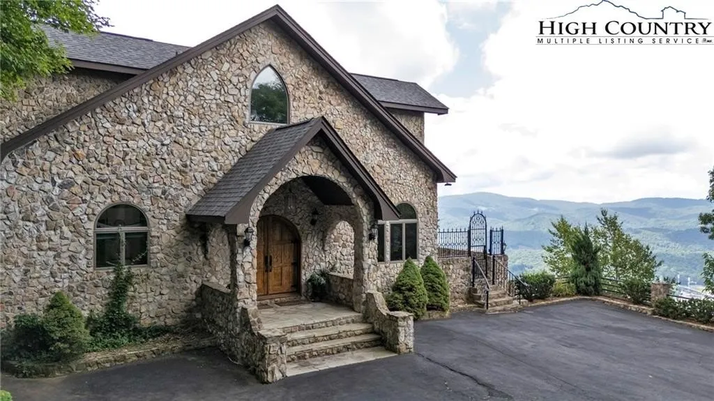 Experience the ultimate in mountain living with this one-of-a-kind property perched atop Howard's Knob, offering breathtaking long-range mountain views, while also overlooking downtown Boone. This custom-built home features spacious rooms throughout, with the main level showcasing an inviting open floor plan. Great room highlights a massive stone fireplace, floor-to-ceiling windows, as well as French doors that open to an expansive stone patio, perfect for soaking in the stunning vistas. Main level also offers a well-appointed kitchen, formal dining room, half-bath, and an impressive master suite. The large master suite is a serene retreat, complete with a rock accent wall, French doors leading to stone patio, and a luxurious master bath featuring separate vanities, a rock shower, and two walk-in closets. The interior boasts vaulted ceilings, arched windows, framed beams, and wide plank ...