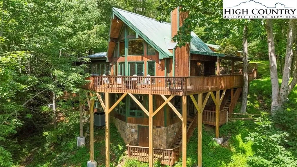 This rustic mountain retreat offers stunning views and quiet seclusion only a few miles from downtown Boone. This one of a kind home offers large vaulted ceilings with exposed beams and a prow of windows which provide lots of natural sunlight. The great room features a beautiful wood burning fireplace with an open floor plan that flows seamlessly into the spacious kitchen. With a laundry room and ensuite primary bedrooms on each floor, private downstairs entrance and ample parking there is plenty of room for guests. The distinctive downstairs primary bedroom is a must see! With its’ custom rustic features, luxury bathroom with vast walkthrough multi-head shower, this bedroom will have you feeling like you are in a high-end mountain spa. The home offers 2 additional bonus rooms, one on each level, that can each be used as an office or to accommodate additional guests. Situated on over 2 acres, the property offers a flat, grassy front yard, wooded areas, views, mature landscaping and a two car detached garage. A whole-house backup generator ensures you won't be left in the dark from any winter storms. All hardwood floors through the home were replaced in 2025, as well as heated tile floors in the bathrooms, fresh paint, brand new HVAC, and tankless hot water heater. Being sold furnished with a few exceptions. The views, finishes, and privacy make this home an ideal rental investment property.