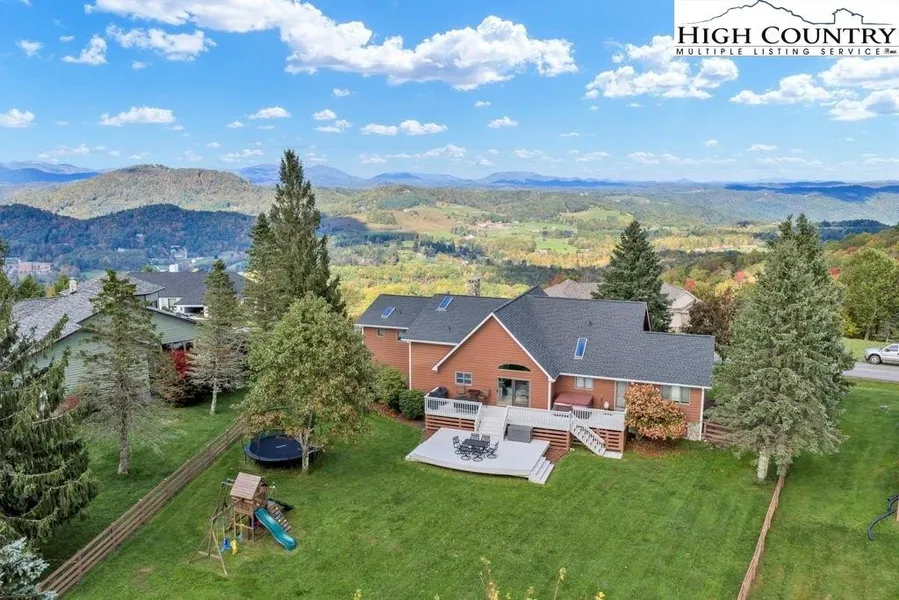 Welcome to Sorrento Skies — where mountain charm meets modern comfort. Perfectly situated between Boone and Blowing Rock, this picturesque home offers breathtaking long-range views AND a flat, fully fenced yard — a rare find in the High Country. Thoughtfully updated inside and out, this home blends warmth, style, and functionality. Step inside to discover beautiful new hardwood floors (2024) flowing throughout most of the main level. The open-concept living area is anchored by a stunning stone fireplace, with sliding doors that open to a serene veranda — the perfect spot to soak in those incredible views. The kitchen was updated in 2024, complete with new appliances, modern finishes, and an easy flow into the dining area. From there, step out into your expansive backyard oasis, where a spacious deck, hot tub, and play area create the ideal setting for relaxation and entertaining.