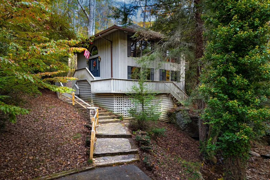 Welcoming streamside mountain retreat in the desirable gated Hound Ears community. Perched alongside a year-round tributary of the Watauga River, enjoy the water sounds and outdoor views from the decks of this four-bedroom, three and a half-bath mountain home. The main level is made for entertaining family and friends with a cozy den and kitchen that adjoins an open living room and dining room. Relax on the upper porch and enjoy grilling outside in the mountain air and sounds of the stream. The second level has two bedrooms sharing a Jack and Jill bath and the primary suite with a spacious bath and walk-in closet, with its porch along the stream. The bottom level features Grandfather Mountain slate flooring, full bath, and bedroom. Level driveway and parking provide easy access. Impressive rock features outside along the stream provide a secluded feel while being convenient to all activi...