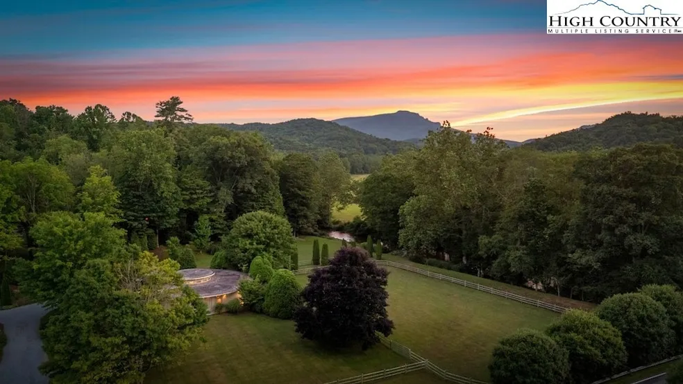 Welcome to Whispering Waters Estate, an enchanting property featuring sweeping Grandfather Mountain views and over 1,500 feet of river frontage along the Watauga River. Nestled on meticulously landscaped grounds spanning over eight acres, this estate comprises several distinctive structures: the Primary Residence, the restored Shulls General Store, and the original Shulls family homeplace. Originally the core of the Historic Shulls Mill community, this versatile estate has also served as a horse farm and a picturesque wedding venue. The main residence, a mid-century modern was designed by renowned architect Gilbert Spindel in 1972. The design features three bedrooms, two-and-a half baths, a spacious great room with a custom fireplace with slate floor, a kitchen, office and music room. The layout centers around an 18ft tall dining room with transom windows and yet another slate floor. The Shulls General Store, circa 1860 has been restored, featuring original wide plank floors and feather board siding. It includes a kitchen, full bath, a guest suite upstairs, and an additional two baths downstairs for the convenience of guests. Adjacent to the store is a transformed six-bay horse barn renovated in 2018 into a 1700 sf event venue with brick paver floors, elegant chandeliers and vintage sconces. Dating back to 1850, the third structure is the original Shulls family home, repurposed over the years as a garden house with two stalls. Follow the evergreen allee/promenade to the riverfront, with breathtaking views of Grandfather Mountain. This property invites creativity, ideal for uses ranging from a private estate to a restaurant conversion, hunting/fishing club or special events. The river frontage is currently leased for fly fishing. Whispering Waters is a property that must be seen to be fully appreciated, showcasing unique architecture, thoughtful design, and limitless possibilities. 2 hours from Charlotte and Greensboro airport.