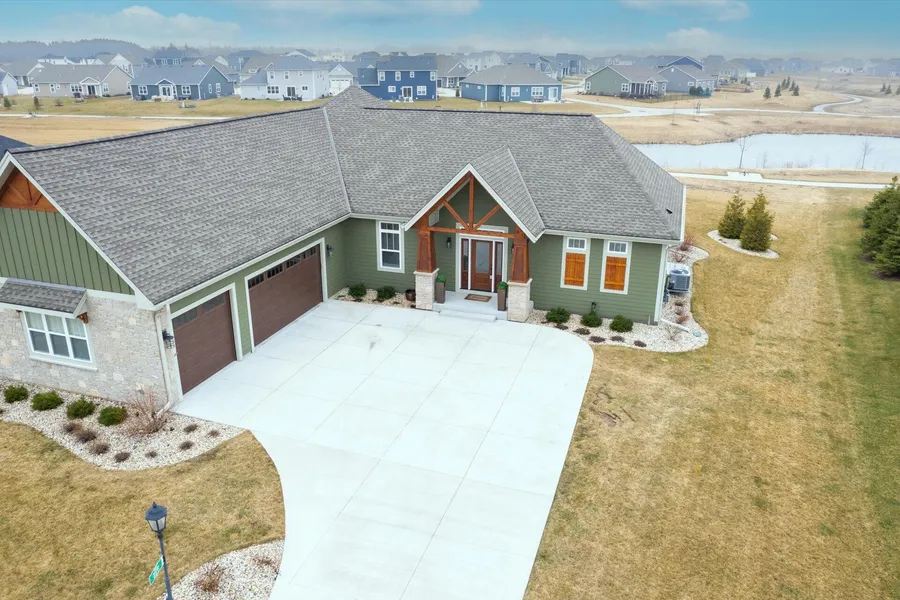 Why hassle with new construction when you can enjoy this stunning Demlang Builders custom three bedroom ranch? Built in 2020 this home will truly wow you the second you enter the door. Entertaining will be a joy with the open concept design featuring vaulted ceilings, stylish barn doors and white woodwork throughout. Massive Great Room with dramatic beamed ceiling and floor to ceiling gas fireplace opens to beautiful kitchen with quartz counters, top of the line appliances, large work island and amazing walk-in pantry. You'll love the bright and sunny dining room surrounded by windows. Retreat to the primary bedroom suite with tray ceiling, walk-in closet and gorgeous bathroom featuring double sinks, walk-in shower and Kohler soaking tub. Floorplan also includes office area, mud room and laundry area. Two nice sized bedrooms with jack and jill bathroom complete the home. Great potential in the lower level with full-size windows and plumbing for a full bathroom. Large screened-in porch and patio area offer views of pond and will be the perfect hangout for you and your guests. 3 car garage plus fully landscaped yard with sprinkler system make this home truly a rare find. Lake Country Village offers two community pools, sports court and walking trails throughout. Conveniently located near freeway access, YMCA, shopping and schools. Welcome home!