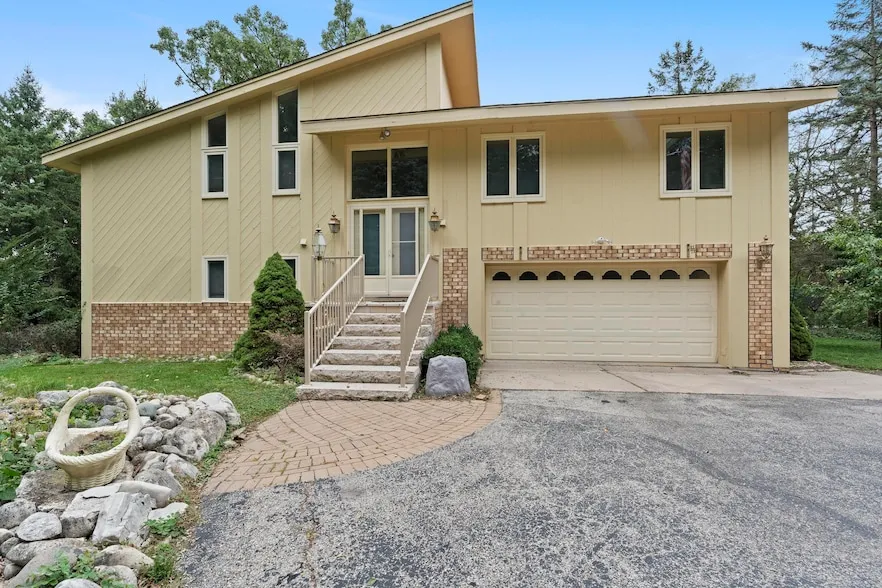 Tucked away on a private, wooded 1.62-acre lot in the Town of Delafield, this home offers that peaceful, ''away from it all'' feeling while still being just minutes from I-94, shopping, restaurants, and entertainment. Surrounded by mature trees, the property delivers both seclusion and conveniencea rare combo. Inside you'll find 3 bedrooms, 2 full baths, and a 2+ car garage, with sun-filled spaces thanks to large windows throughout. The updated kitchen features granite countertops, stainless appliances, and newer flooring that flows into the dining and great room areas. The main-floor bath has been beautifully remodeled with marble flooring, granite counters, and a large soaking tub perfect for unwinding. The primary suite includes a walk-in closet, a makeup vanity, and a private deck.