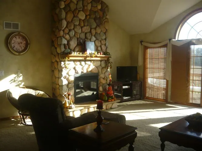 8 acres of privacy, scenic beauty, fruit trees and landscaping, nature views, and sightings of deer, turkey, bear and bob cat. Enjoy the 150 newly planted trees and quiet setting just out of Iola. This great setting has a house with 4 bedrooms, 3.5 baths with a walkout from the finished space in the lower level. Lower level also has a full bath, up north detail/bar area, family room and plenty of daylight windows for a bright spacious family area. Main level has master bedroom suite, formal dining area, vaulted ceilings, massive stone fireplace, and glass doors to expansive deck for views and relaxing.