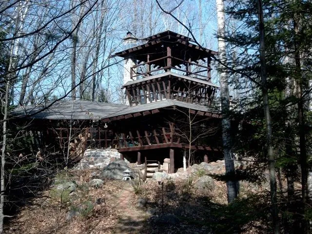 Log home compound featured on Extreme Homes with 3 structures is off the grid and one with nature. The destination, known as Deer Shelter, is on 30 remote acres about an hour from Green Bay or Oshkosh, WI in Waupaca County Wisconsin. You will not only get in touch with nature here, but you share nature in every aspect from the glass tower, enjoying abundant flora & fauna, including black bear sightings and chickadees eating from your outstretched hand. This property is certainly worthy of being featured on Extreme Homes, with a boulder room created from discarded glacial rock, counter-weighted trap door entrance, curved log stairs, glass prow with hot tub, watch tower/eagle's nest, and architectural inspiration from former Wisconsinite, Frank Lloyd Wright. The builders started with a log cabin home and then created the world's tallest birdfeeder structure with interesting sleeping nooks,...