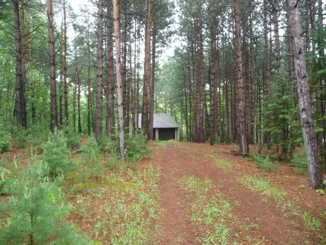 Buildable lot has 24 x 40 ft garage already there. Lot is mostly tall pines for privacy in the woods. The garage has 2 stalls to the front for garage use. Then the rear space is 20 x 24 with vaulted ceiling, glass patio doors for great man cave space or storage. Rear faces woods for maximum privacy on patio.
