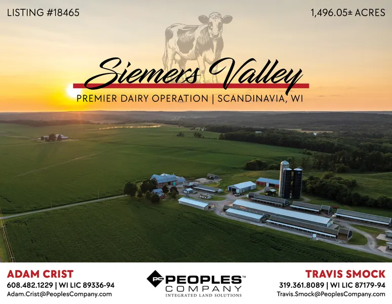 Peoples Company is proud to present a rare and exceptional opportunity to acquire a complete dairy farm located in western Waupaca County, Wisconsin. Spanning 1,496.05 total acres, this storied, well-managed dairy operation includes 1,304.07 FSA cropland acres, with nearly 800 tillable acres under pivot irrigation, and over 500 dryland farmable acres. The 11 pivots fed by drilled wells offer consistent productivity and efficiency. Additionally, there are over 360 leased acres located adjacent to the dairy operation being farmed.
