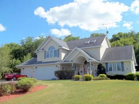 Attractive Newer Home sitting on 1.9 acres close to Hwy 10. The setting is as attractive as the home with a manicured lawn, weeping willows, mature pines, berm focal points, perennials,and a large covered porch to enjoy your private views. Inside are all the details of a fine home including a stone fireplace, crown moldings, built-in TV center, skylights, and open staircase. Also enjoy glass sliding doors to the deck and breakfast counter in the large eat-in kitchen. There is a 3-car attached garage and detached 2-car garage for tinkering or toys. Location provides easy access to Fox Valley area for commuters.