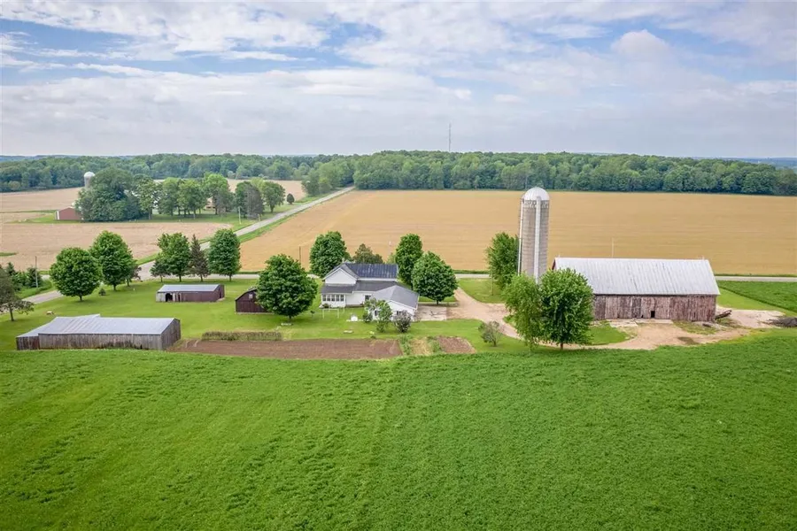 Country living at its finest! 17.67 +/- acres, mostly tillable! 2624+/- sq ft 5BD, 2BA home is sure to please. Main level offers a large galley kitchen with an abundance of cabinetry. Family room with patio doors and pellet stove. Main floor laundry. 3 spacious BDS, full BA, huge living room, dining room, 3 seasons room, and front foyer. Upper level offers a loft area, huge walk-in closet for storage, 2 spacious BDS and full BA. 3.5 car detached garage. Barn with lean to and silo was previously used for beef cattle. 3 additional outbuildings hold no value. Property sold as-is.