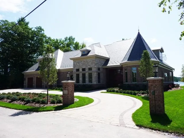 This custom-built executive lake home is among the finest waterfront homes on the Chain O Lakes. This elegant brick and flagstone home has fine detail and appointments throughout while offering well-planned spaces, comfort and panoramic eye level views of the water. The pillared entrance curves with decorative pavers to the arched double door made of custom-milled cherry wood and inlaid glass. Step into the home and the clear blue lake immediately becomes part of the architecture. The kitchen has a wall of custom cherry wood cabinetry, granite counters, built-in Thermador appliances all accented with custom imported tile. Features include drawer-model microwave to pot filler at the stovetop and built-in wine/beer bar. Choose to dine in the private dining room with sloped ceiling and elaborate chandelier or step to the breakfast room with barrel ceiling and 3 walls of windows to the lake....