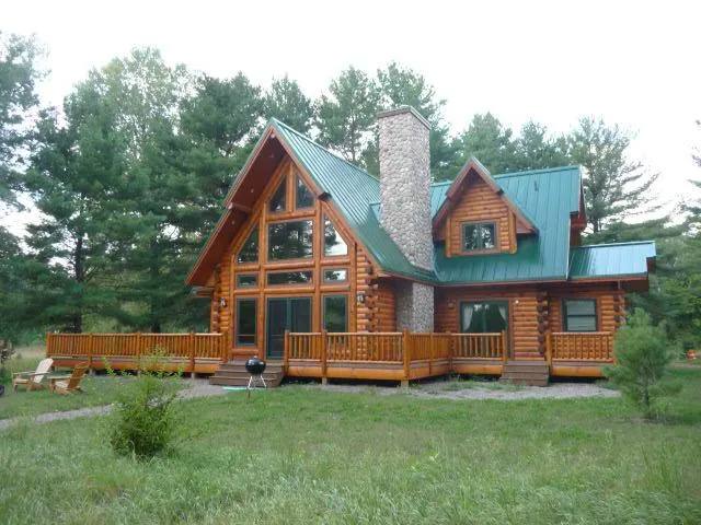 All new log home built by Strongwood Log Homes on Waupaca's Chain O'Lakes! Construction has just been completed on quality-built log home on the waterfront that is Green Certified (16 page checklist) and is Wisconsin Energy Star rated. The goal was to use only sustainable materials, comply with Forest Stewardship Council, low VOC paints and stains, using American made products specifically from Wisconsin based companies so that the structures are environmentally responsible and resource-efficient throughout the building's life cycle. The custom design optimizes lakefront lot for southern exposure and waterfront views. Home features 3 bedrooms, 2.5 baths, and main floor master suite with private entrance to deck. Enjoy an open-concept floor plan, stone fireplace, gourmet kitchen with concrete counters, and all E-Star appliances. Details throughout are upscale and state of the art yet the setting provides a total Northwoods experience. Enjoy 100 feet of frontage on one of the 22-spring-fed lakes known as the Chain O'Lakes just 2 hours from Madison or Milwaukee. These lakes, formed by retreating glaciers, provide endless recreation from swimming to fishing to kayaking. Hop in your boat and motor to dinner, entertainment, mini-golfing, or a secret fishing hole. Year' round beauty reflects the changing seasons and offers new recreational opportunity/experiences both on and off the water in the charming communities such as the Yankee Village of Rural or the Amish community of Amherst. This is a beautiful log home that offers you not only a place to live but a total lifestyle package on the waterfront. Call for more GREEN details. There are two homes/floor plans from which to choose.
