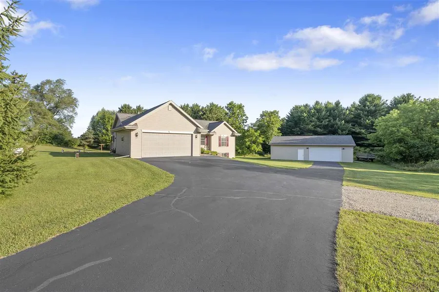 Enjoy the peaceful surroundings of this meticulous home nestled on 5 Acre wooded lot- within 30 min of Appleton. Store all of your toys in this fully insulated 30x44 Stick built garage w/220V & 10ft walls. Exposed Lower Level features 1300 unfinished sq ft, 9ft ceilings, 4 egress windows & stubbed for full bath. Open Concept kitchen/dining/LR with gas FP. Sliding doors to composite deck overlooking private yard w loads of wildlife. Incredibly efficient Energy Star home, LP Tank owned, conventional septic & curb appeal borders professional landscaping. Don't miss out on your dream home!