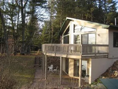 Private lake home is 1 of 24 secluded homes sites on scenic Twin Lake. A wall of windows with southern exposure provides morning sunrises and evening sunsets over 93 acre lake. This parcel has a sand beach and 108 feet of sand bottom frontage. Enjoy the views and privacy from a huge deck or lower level patio framed by fieldstone terraces of beautiful perennials. This pristine unique setting is rivaled only by the well-maintained 6-yr new home that makes this lifestyle package a rare find. The 2500 sq ft home has many upgrades including custom cedar ceiling, ash flooring, high-end fixtures, and whirlpool tub in master bathroom. Layout allows you to enjoy your privacy or entertain beautifully. Casual family room in the LL has walkout patio doors to lake. Appliances, bonus garage, shoreline storage shed, and portable aluminum dock are included. Additional 29 adjacent acres also available fo...