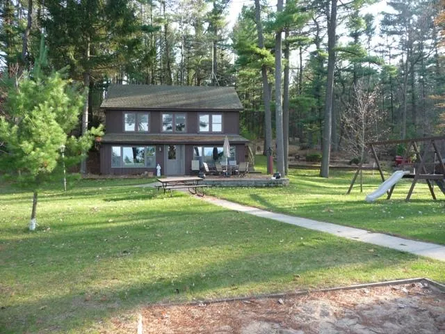 Firm sand frontage on Long Lake in Waushara County provides a beautiful location with panoramic views. This level parcel is part of the Sandy Beach plat which gives description to the 185 ft of frontage on a full recreational lake. The large year'round cottage home is 2150 sq ft with up to 7 bedrooms plus additional sleeping quarters in the detached bunkhouse. The private level lot is like a park with plenty of room for games and outdoor fun for large groups. The open-concept kitchen opens to a great room with fireplace and from there it opens to the patio for pefect lakefront enjoyment. Other features include woodburning fireplace, walkout lower level with finished spaces, AC, appliances, This is one of the best waterfront locations on Long Lake with a large level yard that could also be home to new construction if desired. With all the living space, bonus bunkhouse and large parcel this set up would be perfect for large groups, family compound, or summer rental for income. Or consider this your investment piece and start making memories here while you consider your options of someday building on dream home on this idyllic frontage.