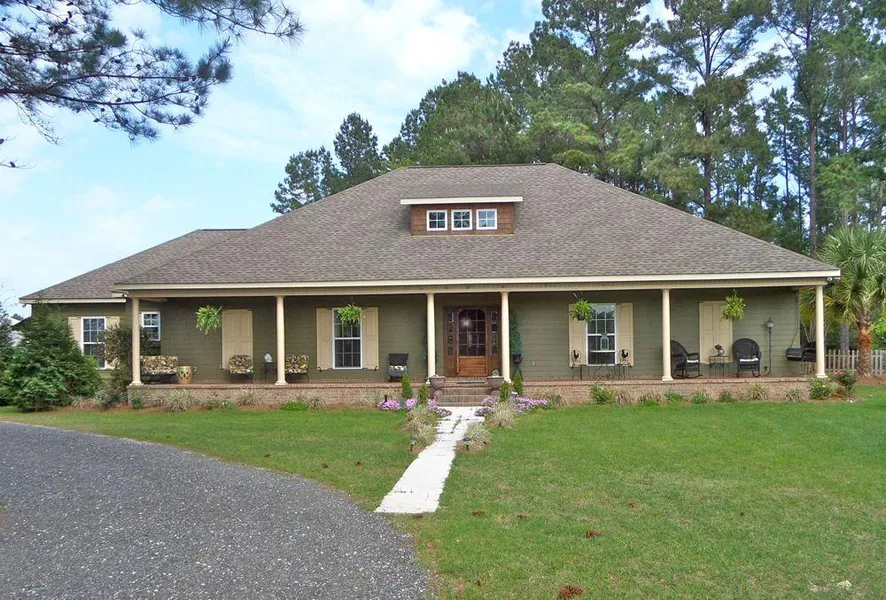 As you enter the premises, you are welcomed by a gated, rocked drive alongside a fenced pasture that leads up to a pine shaded circle in front of a beautifully landscaped home. Walking up the stone laid walkway and upon the breezy front porch, the antique wood stained glass door greets you. The first step into the foyer, you will see nothing but magnificence. Cathedral wood planked 21 ft ceilings laced with glistening chandeliers that provide a spacious atmosphere along with an open floor plan and large wall of windows in the main living area. The Casha hand scrapped walnut wood flooring is impressive in addition to the aged bricked fireplace, intricate crown moulding, and double glass doors. The office is garnished by starch white columns and custom made bookcases. After a hard day's work, if you want a more relaxing area, try the soothing sunroom. Lined by only sunlight and floor-to-ceiling windows, pecky cypress beamed ceilings, hardwood floors, and its very own gas log fireplace with an eye level skylight, this room is absolute tranquility! The kitchen, only a few steps away, is ravishing yet comfortable. With granite counter tops, tiled backslashes, stainless appliances, deep copper sink, custom made island, dropped lighting, bar top with chairs, and walk-in corner pantry, it is more than accommodating. The spacious master bedroom is much like the rest of the home with over-the-top luxury. Calming colors, life size wall windows with double doors that open onto the rear porch, bricked fireplace with wall mounted television, hardwood flooring just to name a few. Adjoining is the large master bath with his and her sinks, custom cabinetry, his and her individual walk-in closets, a Jacuzzi jetted tub nestled beneath a private window, along with a private stool, and a stand up tiled shower. The two spare rooms showcase rich wall colors, walk-in closets, large windows and a huge spare bathroom with a sizable sink and extra counter space, custom built cabinetry, tile flooring, and a standup shower with tile backdrop. Even the laundry room was built to perfection with designer tile half up the wall and cabinetry over the units. As you begin to exit the home through the 2 car garage, take note of the large user friendly mud room to the side. This is a nice perk for additional storage or cleanup.
