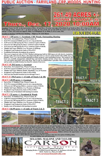 Location: Tracts 1 & 1B at the intersection of Hwy. 45 and Hwy. 15 at the west edge of Fairfield, IL go North on Hwy. 45 1 1/2mi. to CR 1000N, turn West and go 1/2mi.; Tracts 2 & 3 go West of Cisne, IL 1mi. on Rt. 161 to CR 1325E for Tract 2 turn North and go 1/2mi., for Tract 3 turn South and go 1 1/2mi.; All Tracts are approx, 50mi. S of Effingham, IL & 100mi. E of St. Louis, MO.